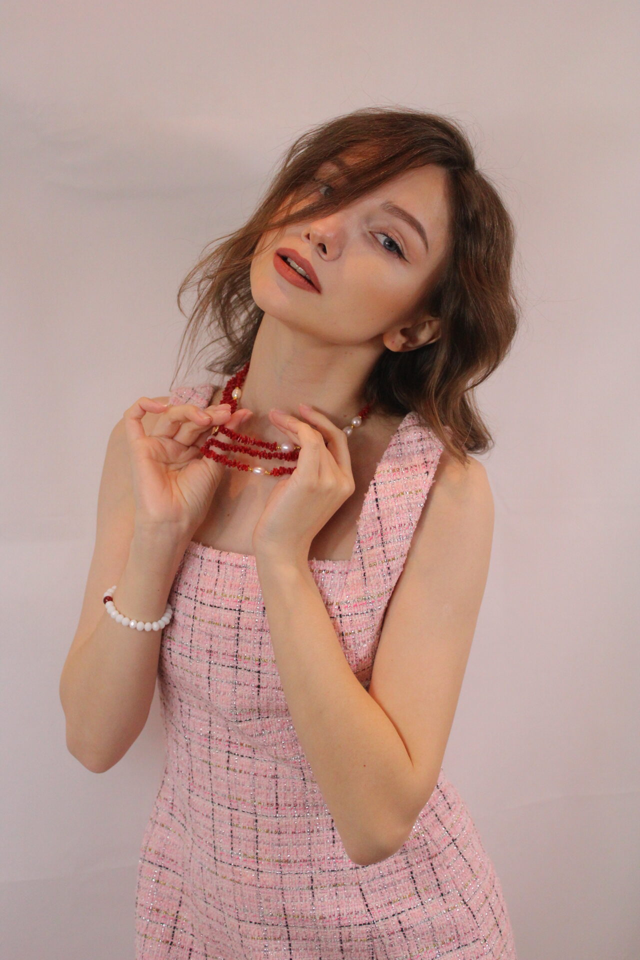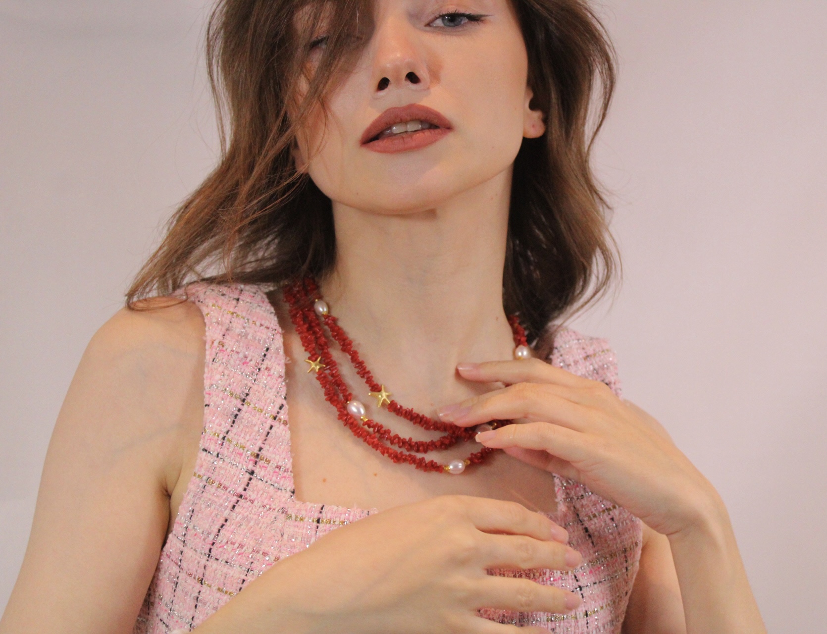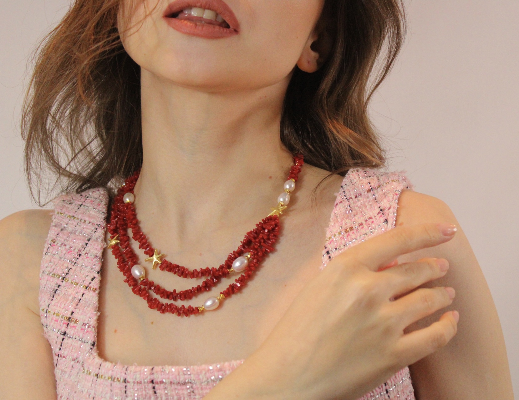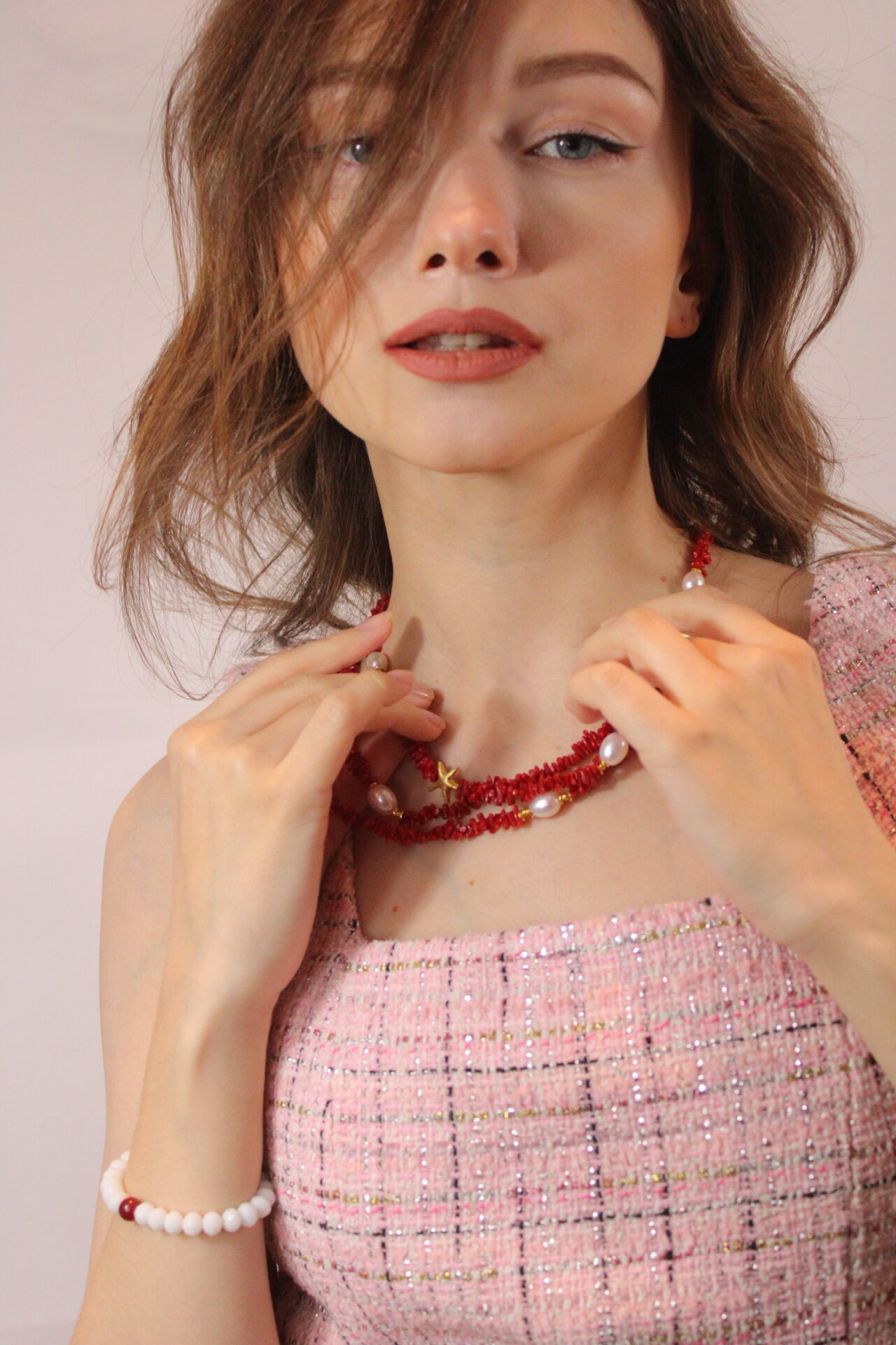 De zachte glans van zoetwaterparels (ongeveer 10 x 8 mm) vormt een dromerige harmonie met de dieprode sardine bloedkoraal kralen (ongeveer 8 x 4 mm), die hun natuurlijke gloed onthullen bij elke schittering van het licht.