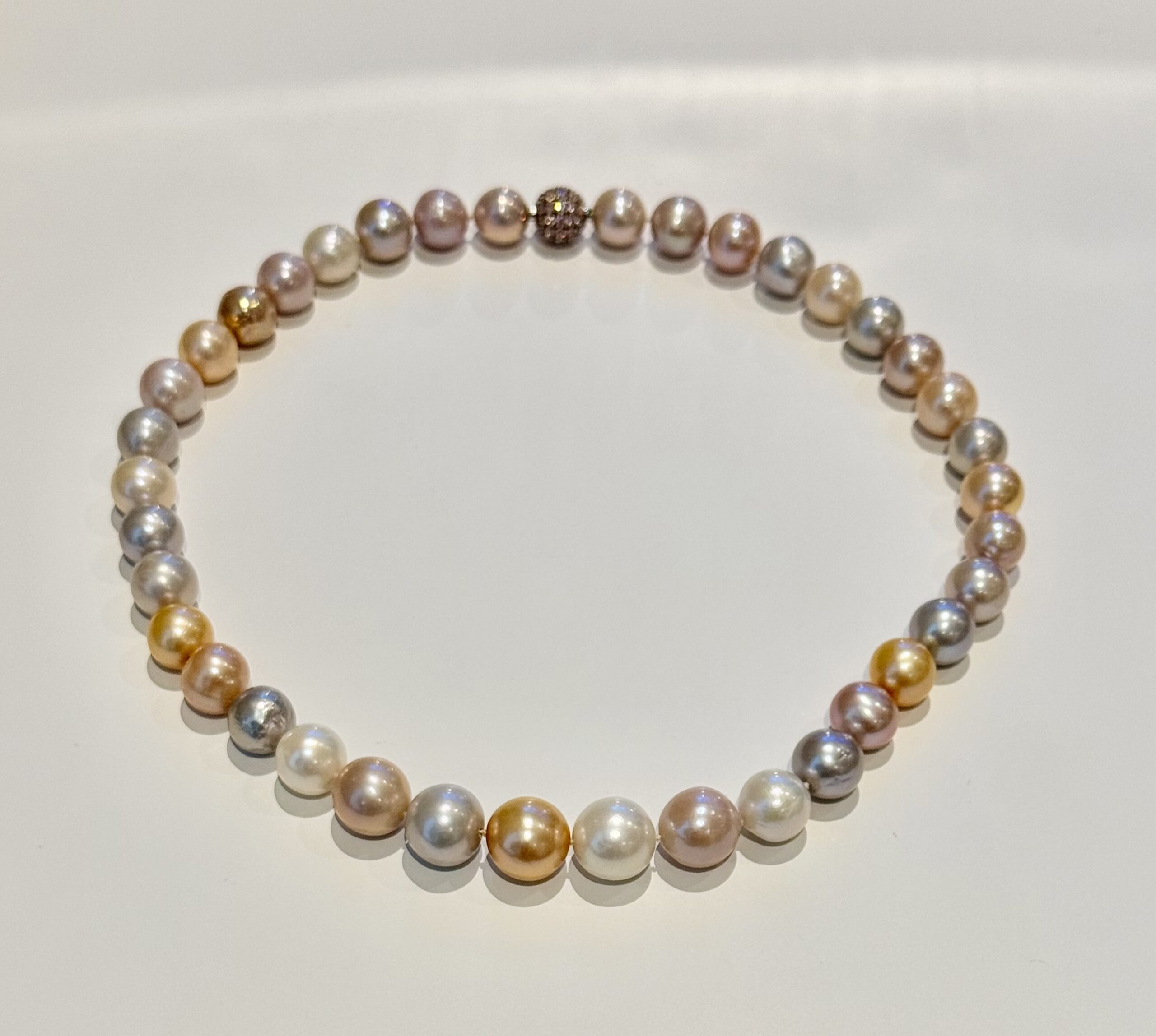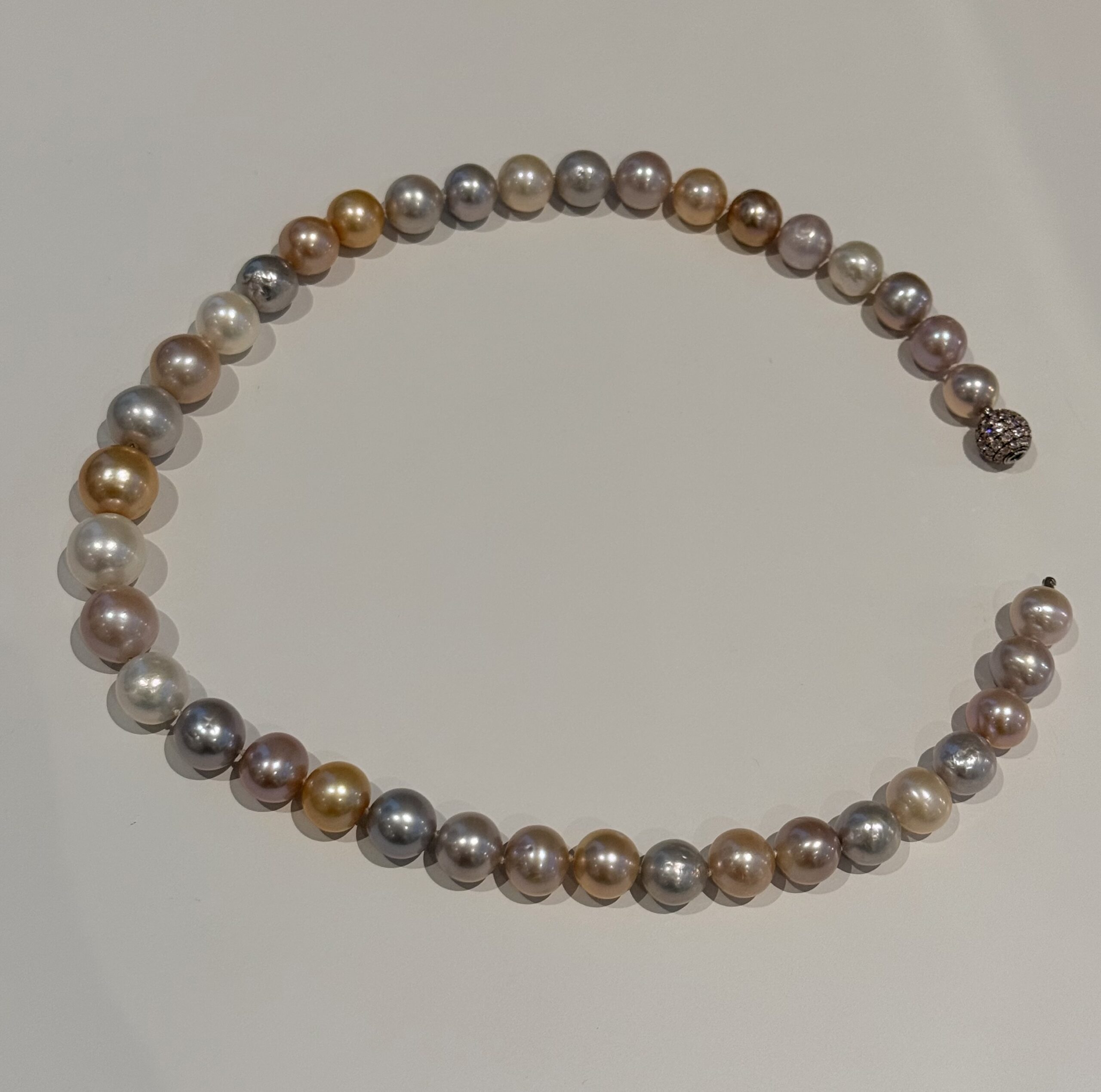 De parels hebben aan het oppervlak enkele lichte natuurlijke groeikenmerken die niet afdoen aan de elegantie van de ketting.